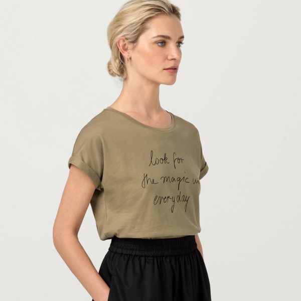 Mit Print im Handwriting-Stil auf softer, GOTS-zertifizierter Bio-Baumwolle: das HALLHUBER T-Shirt mit Statement-Wording look for the magic in every day sorgt für positive Stimmung. Fixierte Ärmelaufschläge und der lässige Oversize Fit machen das Shirt zum exzellenten Casual-Style.