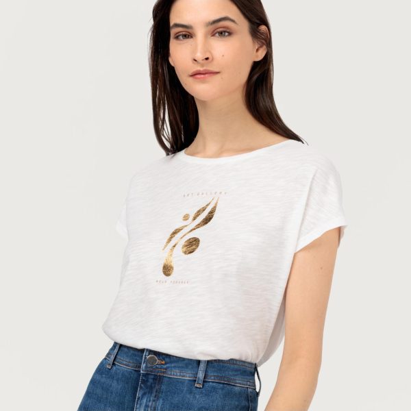 Ultrabequem und mit kunstvollem Foliendruck in Gold: das HALLHUBER Oversized Shirt mit flachem Halsausschnitt und überschnittenen Schultern. Der Print auf der Vorderseite besteht aus geschwungenen Grafiken und zwei Statements. Die Qualität: softes Flammgarn im Baumwolle-Modal-Mix. Unser Kombi-Tipp: Stylen Sie das T-Shirt etwa unterm Blazer mit Jeans und lässigen Sneakers.